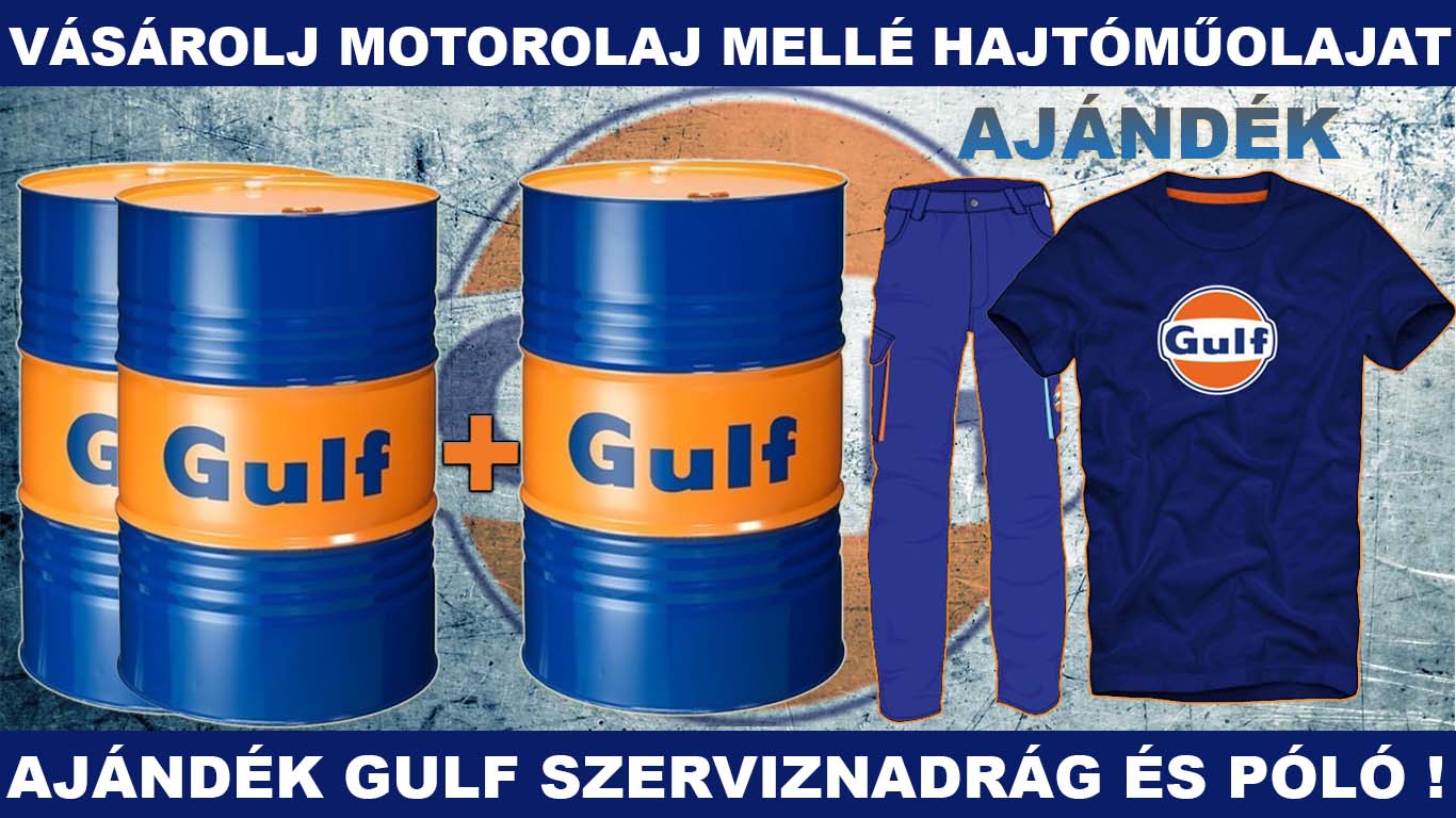 MINDEN hordós GULF motorolaj mellé, ha hajtóműolajat is vásárol, LIMITÁLT GULF szerviznadrágot és pólót adunk ajándékba!