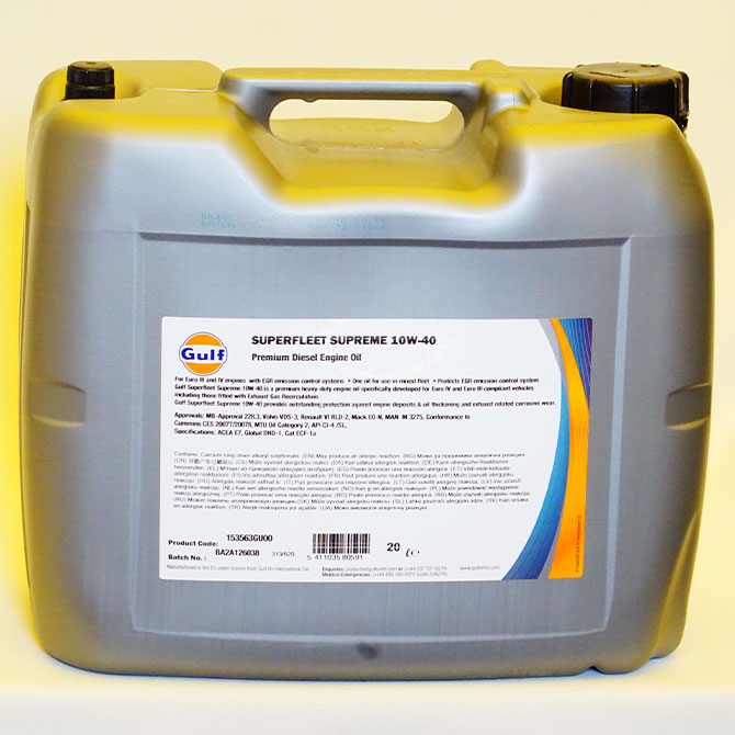 • A Gulf Superfleet Supreme egy extra nagyteljesítményű diesel motorolaj, amely a modern, alacsony káros anyag kibocsátású diesel motorokhoz lett kifejlesztve, beleértve azokat is, amelyek kipufogógáz visszavezetéses rendszerekkel (EGR) vannak felszerelve.