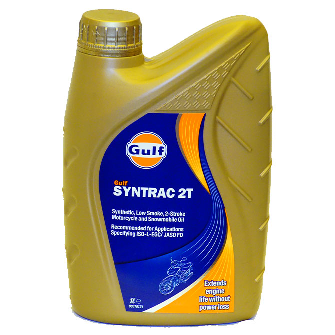 A Gulf Syntrac 2T egy magas teljesítményű szintetikus kenőanyag, ami kifejezetten a nagyteljesítményű kétütemű benzinmotorokhoz lett kifejlesztve. Egyedülálló összetétele szintetikus bázisfolyadékok és modern adalékok keveréke, ezáltal kitűnő motorvédelmet, tisztaságot és alacsony füstkibocsátást biztosít extrém használati körülmények esetén is. Ezen termék túlteljesíti a legújabb JASO FD, ISO-L-EGD, API TC nemzetközi szabványokat, és a vezető kétütemű motorkerékpár és robogó gyártók előírásait.